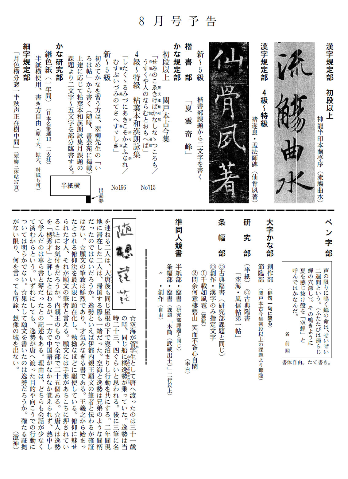 古典臨書研究をベースとして、現代書への展開。漢字、仮名、詩文書、少字・墨象等多彩な書の勉強が可能です。学生部もあります。