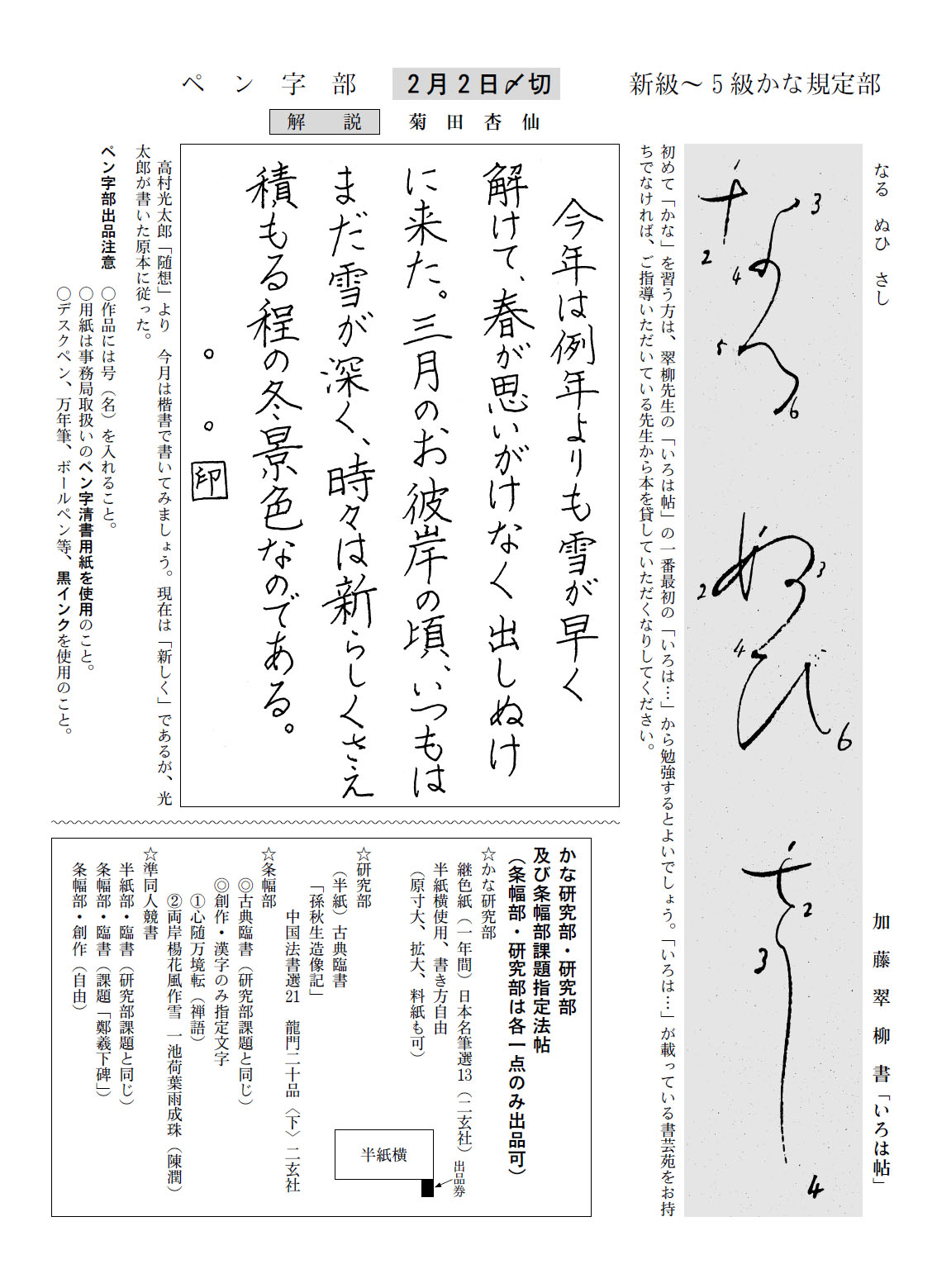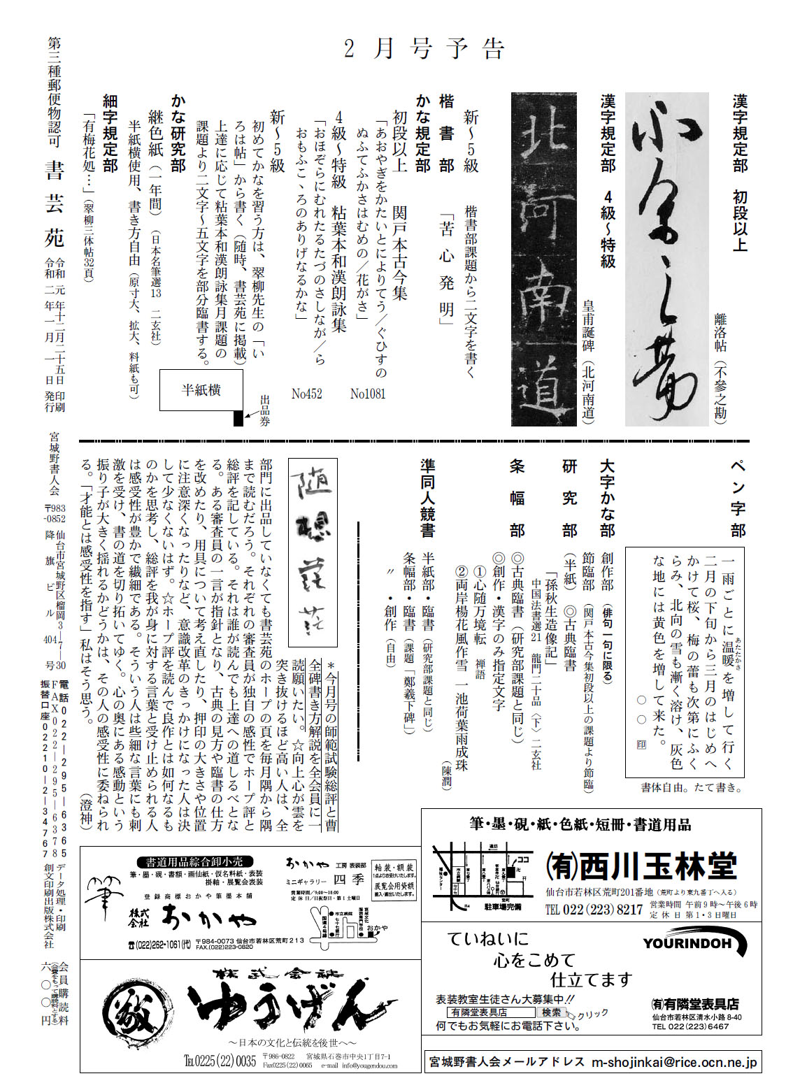 古典臨書研究をベースとして、現代書への展開。漢字、仮名、詩文書、少字・墨象等多彩な書の勉強が可能です。学生部もあります。