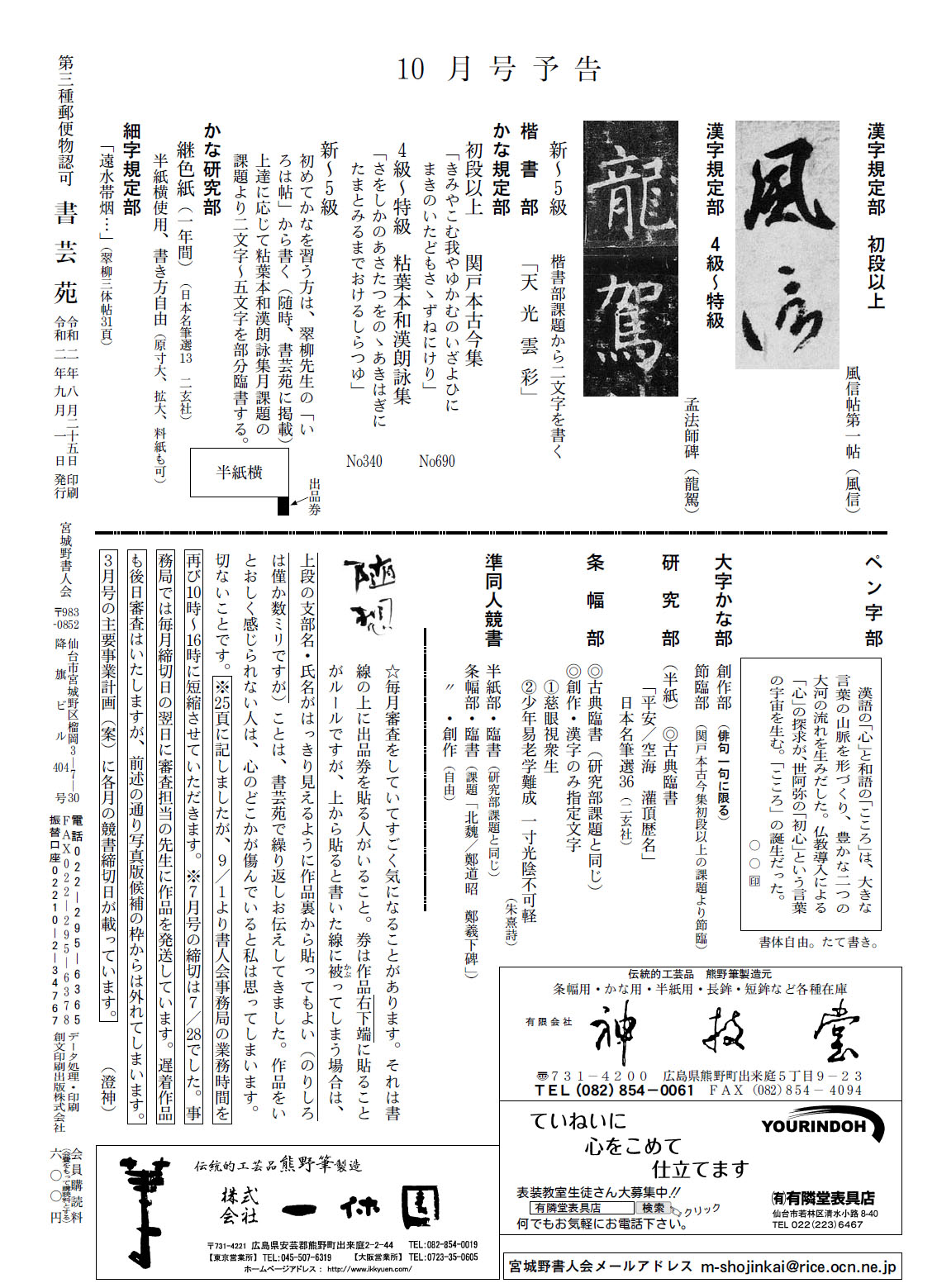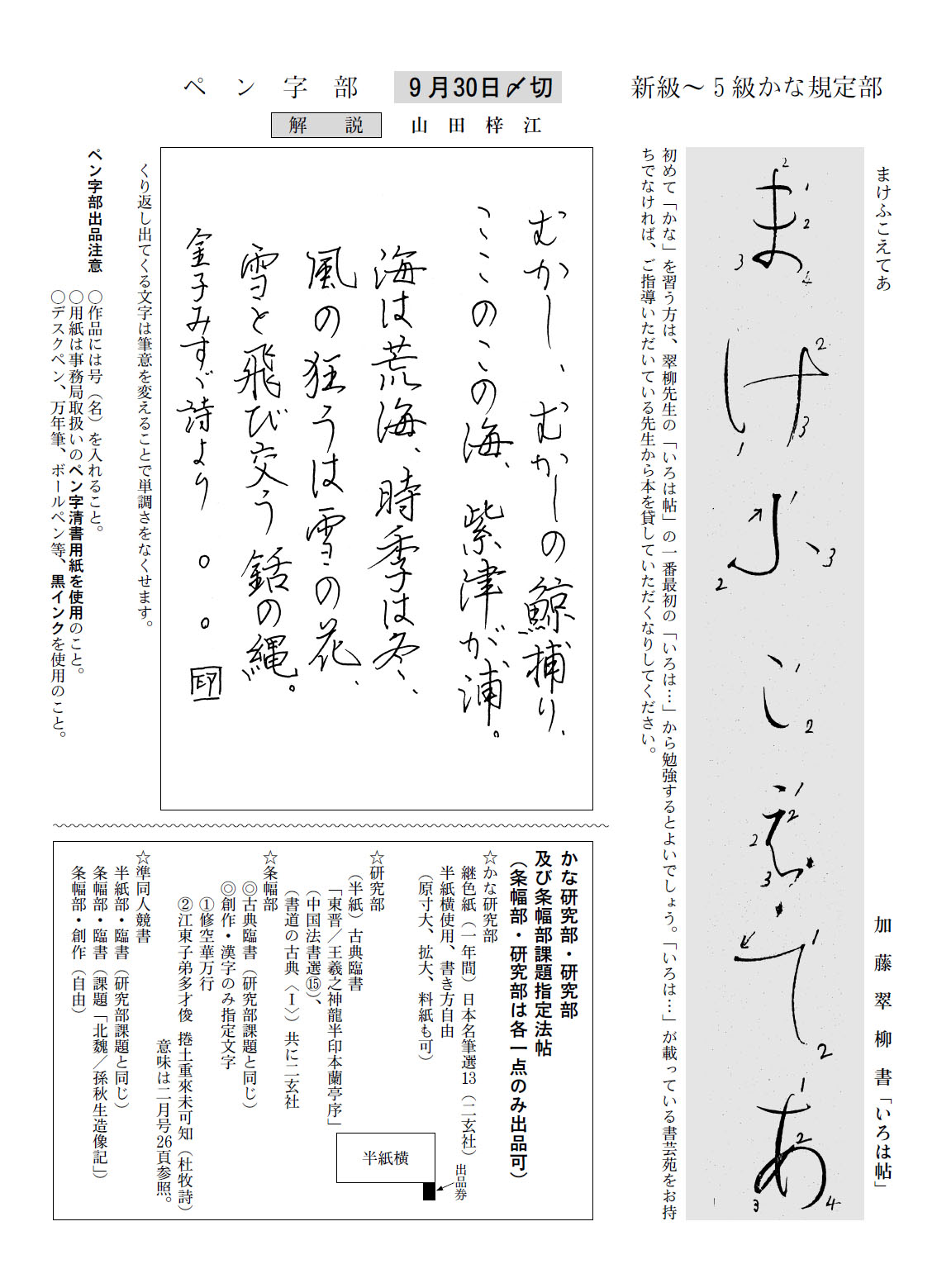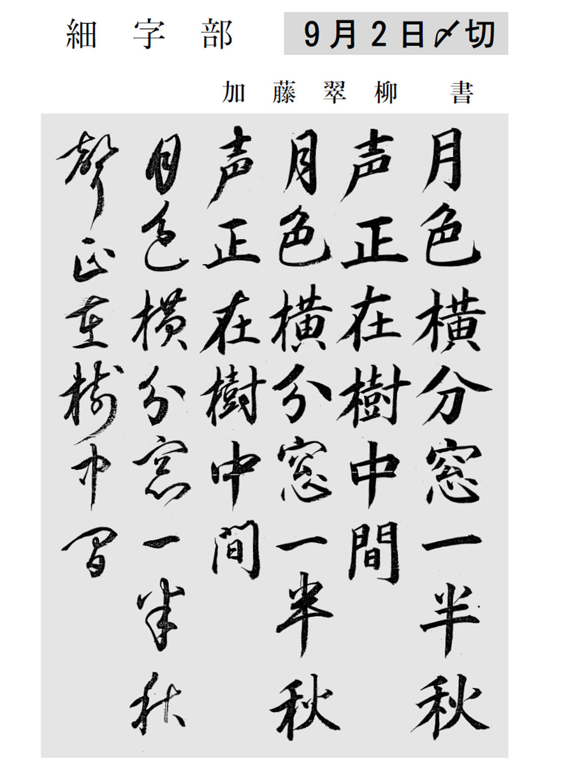 古典臨書研究をベースとして、現代書への展開。漢字、仮名、詩文書、少字・墨象等多彩な書の勉強が可能です。学生部もあります。